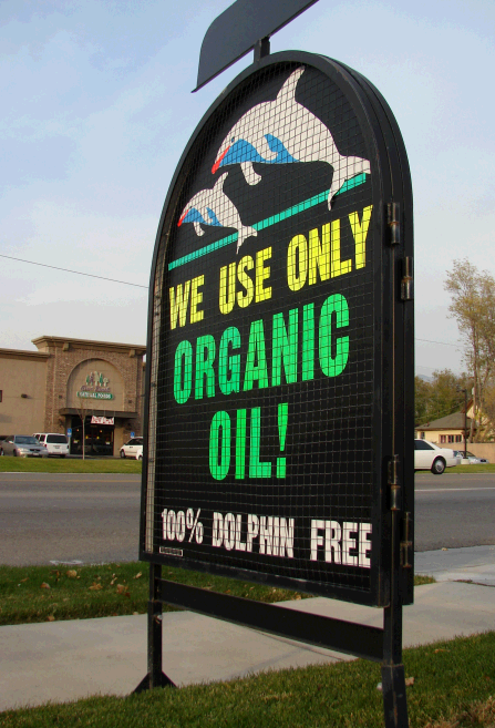Tuesday, October 30, 2007Dolphin-Free Oil Now Available in American ForkWorld Class Auto Service on Main Street welcomes a new neighbor. Will Good Earth Natural Foods reciprocate? It might be amusing. There I was, minding my own business on Saturday, returning home from a drive to somewhere south of American Fork. I was eastbound on American Fork's Main Street when I saw a sign. No, it wasn't a sign in the religious sense. It was a sign in the this-is-the-sort-of-sign-I-photograph sense. At World Class Auto, right across from the new Good Earth Natural Foods store, they have put up two signs, actually. They both look like this: