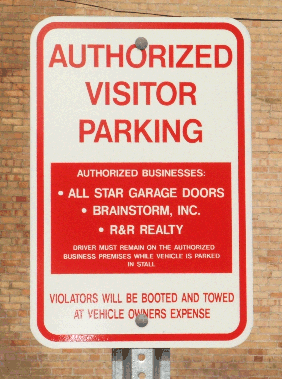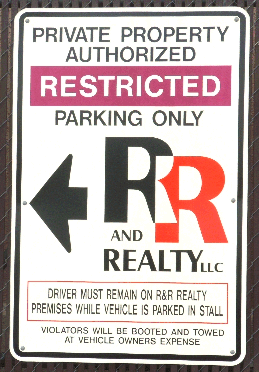 Ah, yes. Either $65.00 to get the boot removed, or $157.00 for the tow. This spurred the mayor to seek passage of a new ordinance, setting maximum fees for towing companies within city limits. These price caps, I'm told, were to be $15.00 for the boot and $25.00 for the tow. There's a very interesting question here, to which I don't know the answer: Who was it who got booted and/or towed? In other words, who has such clout with Mayor Thompson that he would not only propose the ordinance, but try to call an emergency meeting to get it passed? If he were engaged to be married, and if the wedding were imminent, and if the future mother-in-law already didn't like him, and if she were the bootee or the towee, this level of urgency might make sense -- but these conditions do not seem to apply. We may never know who elicits such a response, but that's okay. There are other fish to fry here at the blog. Before we throw them on the skillet, however, you need some more background. More Background For most American Forkers, the most recognizable description of the lot's location will be this: Its entrance and much of the lot itself are between the old Yogurt Parlor and the old Six Star discount store. For the rest of you, that's between Merchant Street and 100 West, on the north side of Main Street. There is an exit from the lot just south of the post office on Merchant Street. The lot is the private property of a prominent American Forker, Bill Jacob. (Did I mention that its private property?) The City's contribution is a small sign at the entrance, posted too high for some drivers to see, that says, "Private Parking. Permit Required." There are dozens of parking spaces in the lot, each reserved for someone, either current customers of a particular business, or employees, or perhaps others who have purchased the requisite permit. There is one sign for every parking space, and then some. Even if you miss the little City sign at the entrance, you could hardly miss, or even misinterpret, the other signs. There are many of these:
