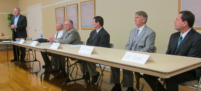 Wednesday, October 23, 2013Meet the American Fork Candidates, Round Two: SummaryHere I report mostly what wasn't already said at last week's event. There were some new questions. Photos and links to audio recordings of all answers and statements are included. [Note: Since posting this, I have fixed some typos and tweaked some of the writing for clarity, without modifying the substance. -- DR] Event and Format This evening, the second of two meet-the-candidates events was held in American Fork at the Senior Center downtown. It was sponsored by the Youth Student Council and moderated by former Councilman Shirl LeBaron, a veteran of many such events. Once again, all five candidates were present: Mayor J. H. Hadfield and his opponent Bill Thresher, and, vying for two available city council seats, incumbent Craig Nielsen and two challengers, Jeffrey Shorter and Carlton Bowen.